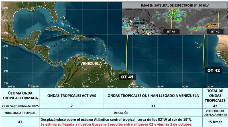 En cuanto a la ubicación de las Ondas Tropicales, la número 42, situada al este de las islas de Cabo Verde, se estima que llegará a nuestra Guayana Esequiba entre el miércoles 8 y el jueves 9 de octubre.